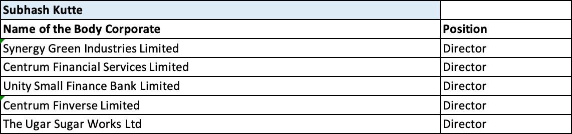 Mr. Subhash Kutte has been a Banker throughout his life. He had joined Ratnakar Bank in June 1980 and served the bank for thirty-four years, initially in an executive capacity across various departments, including MD & CEO, and in the last four years as its non-executive Chairman. He retired as the Chairman of RBL Bank Limited in the year 2014.